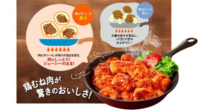 リケン独自の「肉ピタソース」がお肉にピタッと密着することで、加熱中も水分が逃げるのを防ぎ、驚くほどジューシーでおいしく仕上がります。