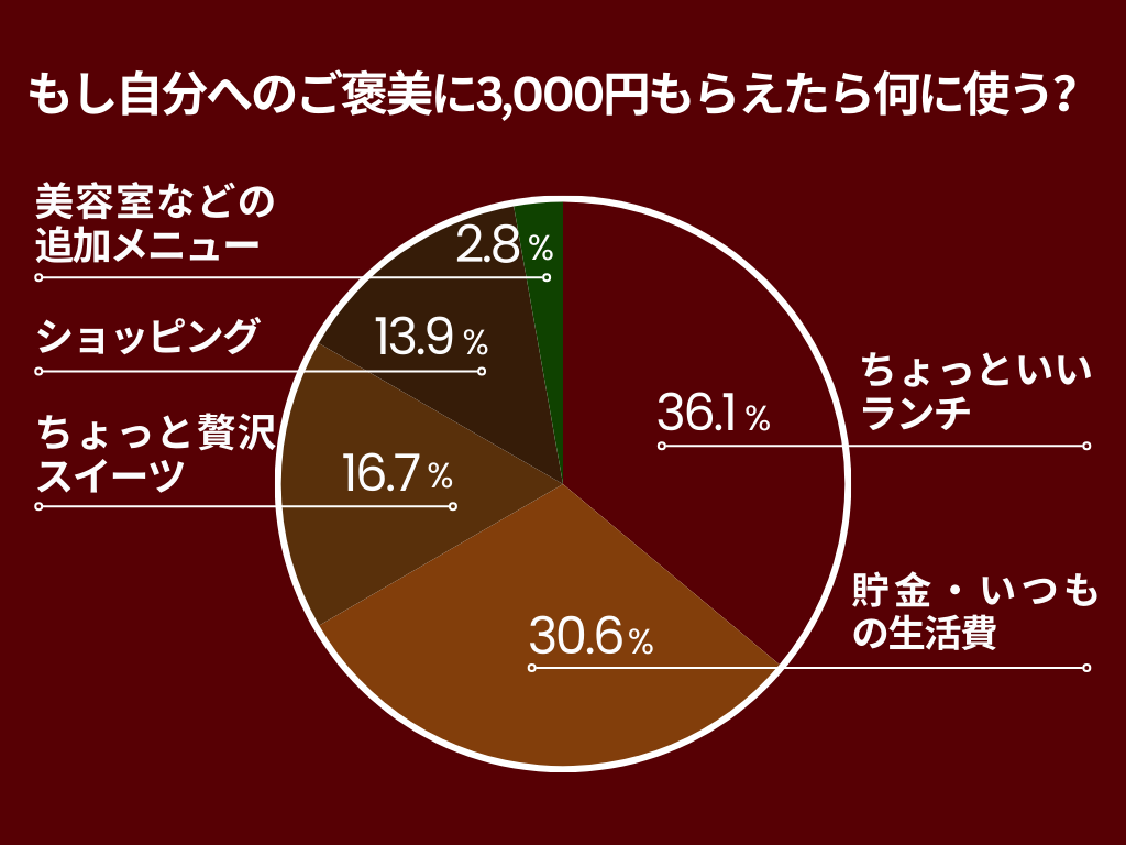 ①ちょっといいランチ(外でゆっくり♪) ②ちょっと贅沢スイーツ(おうちで贅沢) ③ショッピング(自分の服や小物) ④美容室などの追加メニュー(プラスのケア) ⑤貯金・いつもの生活費(堅実派・消える派) |